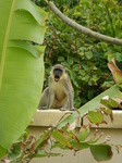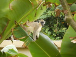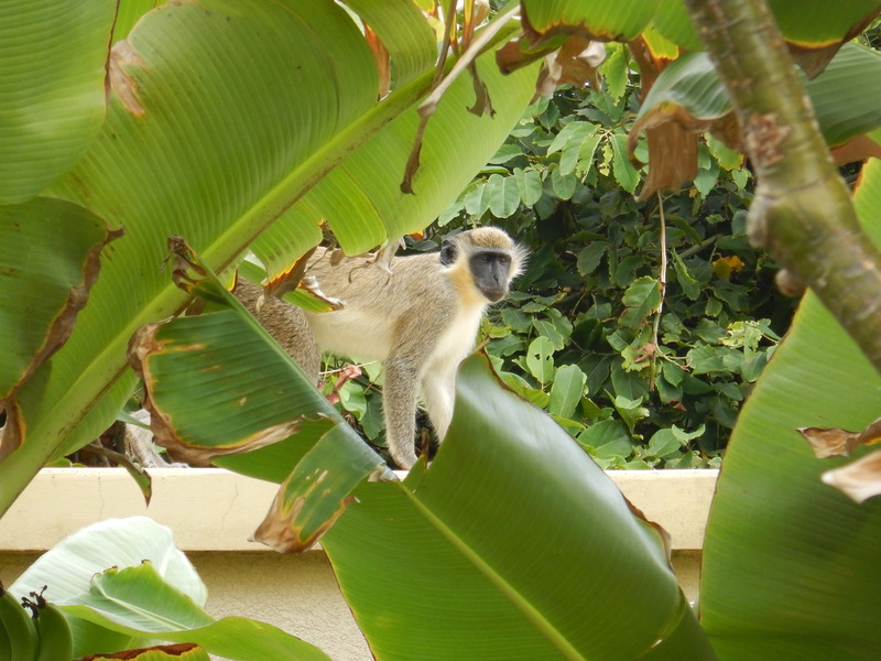 Nach zwei Stunden nichts tun haben wir ein wenig die sehr weitläufige Anlage erkundet. Ganz toll angelegt, flach gebaut, sehr grün und toll bepflanzt. Ich habe zwei Miezekatzen gesehen, was die Sehnsucht nach meinen beiden Räubern ein wenig schmälerte. Und dann saß da auf einmal der grüne Affe. Turnte auf den Balkonen rum und posierte für die Kamera. Herrlich…