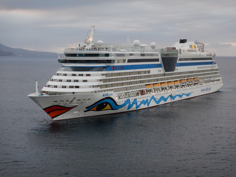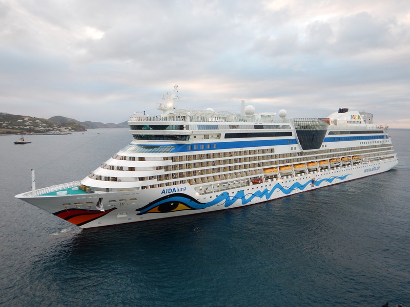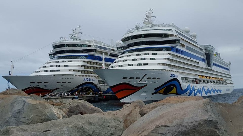 Heute früh gab es schon das erste Highlight des Tages: gemeinsames Einlaufen mit dem Schwesterschiff, der AIDAluna. Für die AIDAmar war es sogar das erste Mal hier auf dieser Insel. Ich habe schon des öfteren zwei Kussmundschiffe im selben Hafen gesehen, eigentlich nichts Besondere deres. Aber in viele Häfen der Karibik liegen die Schiffe nebeneinander und nicht hintereinander. Und so war es diesmal auch. Es war wirklich faszinierend. Man könnte schön in die Balkonkabinen gucken und die Leute beim Schlafen beobachten. Noch ein Vorteil einer Innenkabine… Ich glaube, man könnte auch die Augenfarbe des Kapitäns auf der AIDAluna erkennen.
