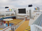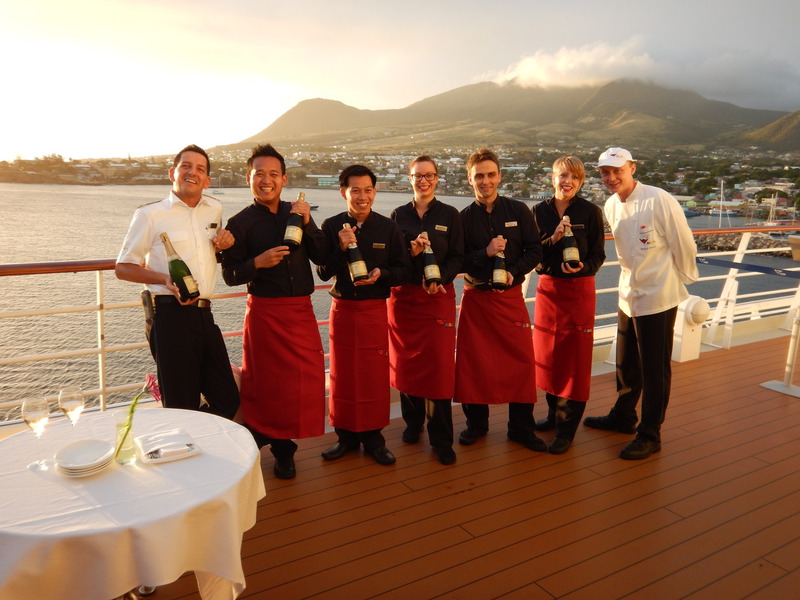 Eigentlich war für heute kein Rossini geplant, da es aber „Rossini einmal anders“ gab, mussten wir natürlich hin, denn dies gehört zu unseren Lieblingsveranstaltungen. In der Regel wird die Anytime Bar gesperrt und der erste Gang wird dort serviert. Treffen ist dann um 17:45 Uhr um das Auslaufen dort zu genießen. Natürlich standesgemäß mit einem Glas Champagner (dabei wäre mir ein Bierchen viel lieber). Der Wettergott hatte andere Pläne: er weinte so sehr, dass sie die AIDAluna und AIDAmar voneinander trennen mussten und das Auslaufspektakel war ziemlich feucht…. Denn immer, wenn man einen Regenbogen in der Karibik sieht, kommt auch der Regen. Liquid Sunshine wird es hier so liebevoll genannt. Diesmal war es aber mehr als das: es war richtig nass!