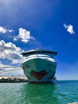 Wir sind dann erstmal eine Kleinigkeit essen gegangen und dann war unsere Kabine auch bezugsfertig. Die Koffer waren schon da, aber wir haben beschlossen, erstmal noch nach Port Louis reinzufahren. Hier fährt direkt am Schiff ein Wassertaxi nach Port Louis rüber. Es ist zwar sehr abenteuerlich, kostet jedoch nur € 2,-- oder USD 2,-- pro Person pro Strecke. Günstiger kommt ihr nicht rüber. Wir haben hier abenteuerliche Taxipreise gehört... Die Überfahrt macht Spaß und man fährt direkt unter dem Kussmund der kleinen AIDAaura durch.
