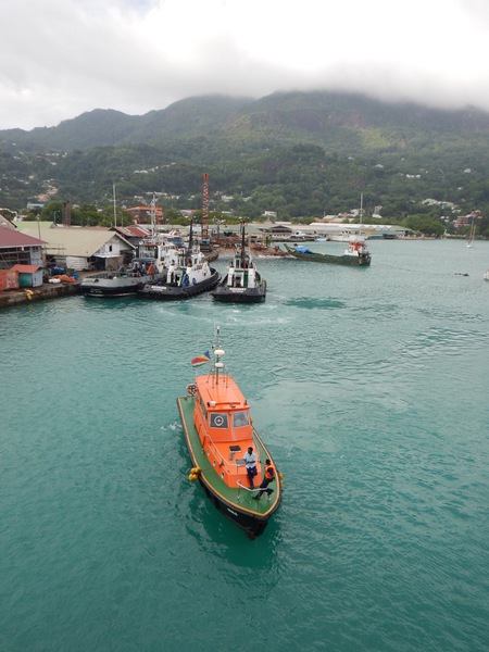 Die Schiffsfreigabe erfolgte um 08:20 Uhr und es kam noch die Durchsage vom Kapitän, dass die AIDAaura morgen Abend (also am 06.12.2017) am Abend ablegt und dann auf Reede liegen wird. Es gibt wohl immer nur Liegezeiten von 36 Stunden, danach müssen die Frachtschiffe den Platz erhalten, um die Waren für die Insel zu entladen. Uns egal, wir fahren nach La Digue. Wir sind dann relativ zügig nach Schiffsfreigabe von Bord gegangen und wurden durch Musik und tanzende, dunkelhäutige Schönheiten (oder auch nicht) begrüßt. Da der Weg zum Fährterminal 1,9 km betrug haben wir beschlossen, das können wir laufen. Und das war in der Tat überhaupt kein Problem. Die Strecke ist nicht schön, denn das Schiff liegt in einem stinkenden Industriehafen, in dem auch Fisch verarbeitet wird. Ich möchte heute Abend nicht an Bord sein und draußen sitzen…. Am Fährterminal von www.seyferry.com waren wir schneller als gedacht. Dort angekommen mußten wir die von uns schon vorab online gekauften Vouchers in richtige Tickets umtauschen und unsere Koffer wurden uns abgenommen. Dann haben wir der Weihnachtsmusik gelauscht, die von nebenan – einem Restaurant – kam, dort hatte eine Kindergartenklasse ihre Weihnachtsfeier. Lauter kleine dunkelhäutige Zwerge mit Weihnachtsmützen auf dem Kopf. Das war echt süß. Das schönste für die Lütten war, wenn mal wieder ein Luftballon geplatzt ist.