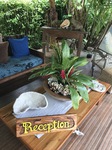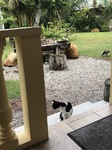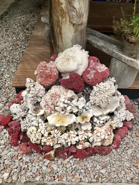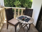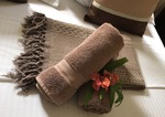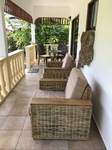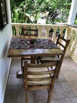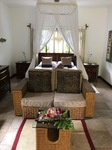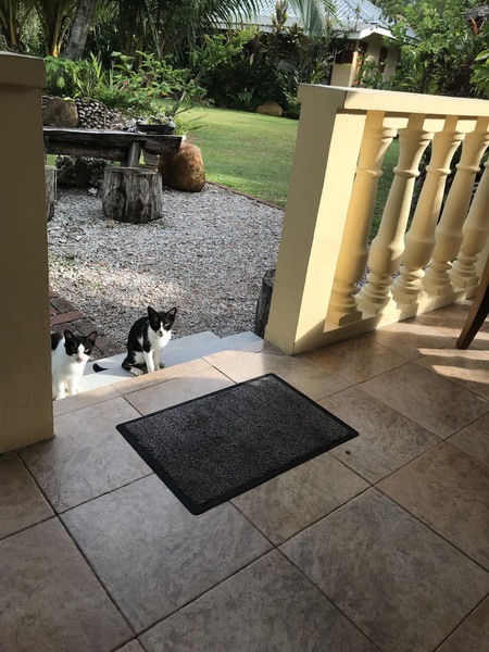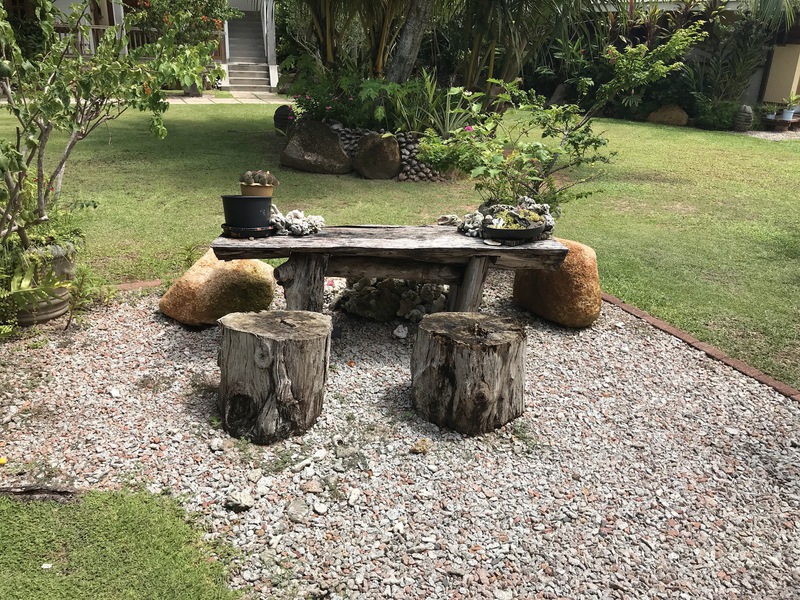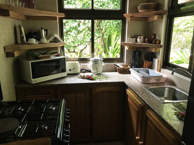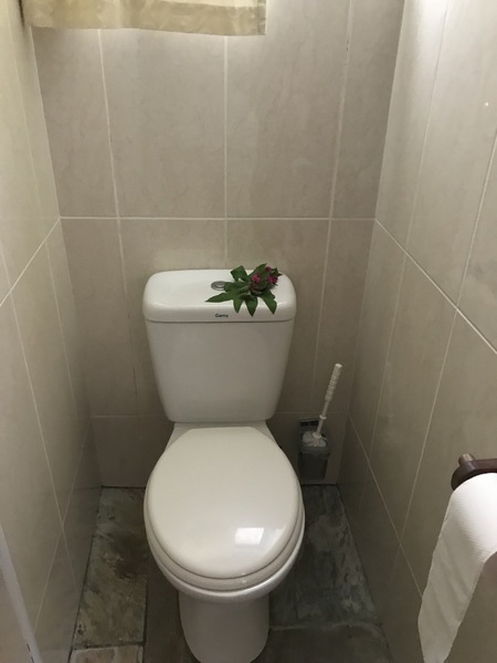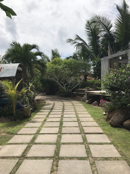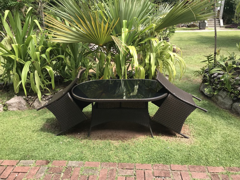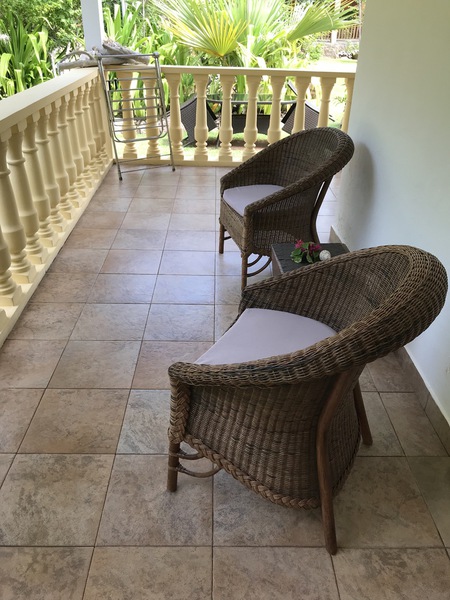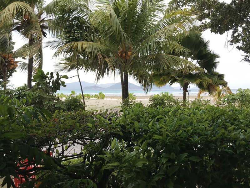 Der Fährhafen – liebevoll Jetty genannt – ist sehr zentral auf der Insel La Digue. Unser Guesthouse, welches wir bei www.booking.com gebucht haben, war gerade mal 10 Minuten zu Fuß vom Anleger entfernt. Und dann waren wir – mal wieder – im Paradies: Das Guesthouse Domaine les Rochers (www.domainelesrochers.com). Wir wurden sehr sehr herzlich durch Kostas – dem Inhaber dieses Paradieses – begrüßt. Er hat uns sehr viel erklärt, wo wir was finden und uns einen hervorragenden frischen Maracujasaft als Begrüßungsgetränk zubereitet. Der schmeckte nach mehr. Wir wurden auch gleich von Bella begrüßt, einer kleinen Hundedame. Paris war der Bruder, obwohl das eher auch weiblich klingt, aber es war gut sichtbar, dass Paris kein Weibchen war… Wir wurden zu unserem Bungalow geführt, welches eine Oase im Grünen war. Traumhaft. Auf der Terrasse diverse Sitzmöglichkeiten. Im Bungalow war alles liebevoll hergerichtet, Kerzen brannten, Blumenschmuck überall. Die Küche – vollausgestattet – war auch klasse. Der Kühlschrank war mit einem Starterpack gefüllt: Frische Eier (die Hühner laufen überall rum), Milch, Wasser, frisches Obst (direkt von den Bäumen im Paradies), Toastbrot, Butter, Marmelade, Saft. Alles was wir benötigen um zu frühstücken. Und es gab Miezekatzen. Da war ich glücklich. Und noch besser: es gab auch Babymiezekatzen. Ich bleibe hier!