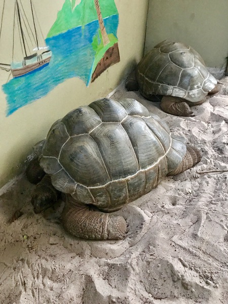 Auf dem Rückweg musste natürlich ein weiterer Stopp bei den Schildkröten eingelegt werden. Wir haben gerade von der „Katzendame“ erfahren, dass die beiden Schildkröten zu einem Hotel gehören, das in der Nähe ist, die beiden dann aber irgendwann die Strandbude für sich entdeckt haben und seitdem dort „wohnen“, weil sie dort die Obstreste bekommen und somit gut genährt werden. Ach, was sind die süß…