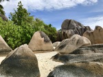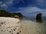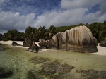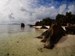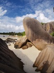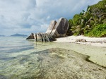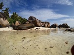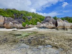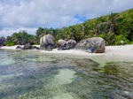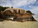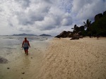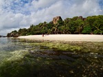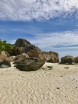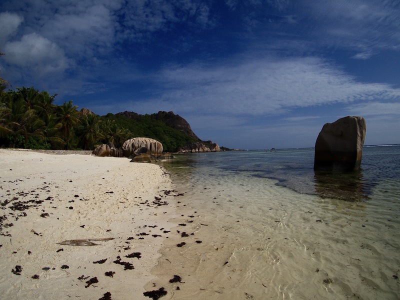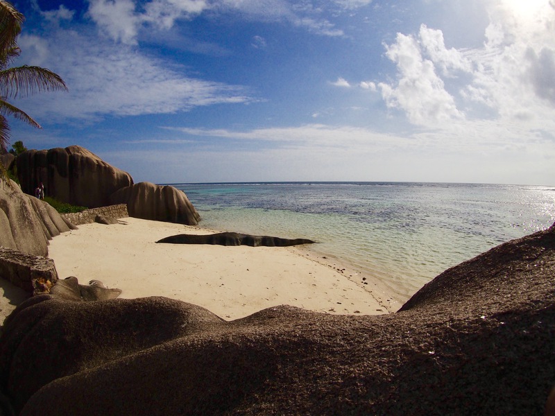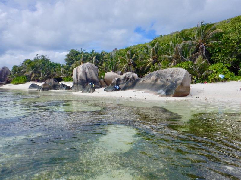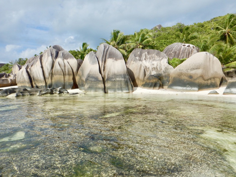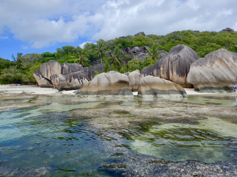 Und dann noch ein paar Meter weiter kam er: der Anse Source d’Argent… Und ich muss sagen: ich war überwältigt. Wir haben ja in den letzten Jahren schon viel von der Welt gesehen, aber sowas habe ich noch nie gesehen. Für mich eigentlich ein Favorit für ein Weltwunder. Es war beeindruckend, atemberaubend, wunderschön. Solche Steinformationen in Verbindung mit Traumstränden. Hammer. Da gerade Ebbe war, konnte man – bitte immer mit Badeschuhen – durch das Wasser laufen. Eine Seegurke wanderte mir auch über den Weg. Diesen Moment konnte man einfach nur genießen. Und es kam sogar noch die Sonne raus!!!